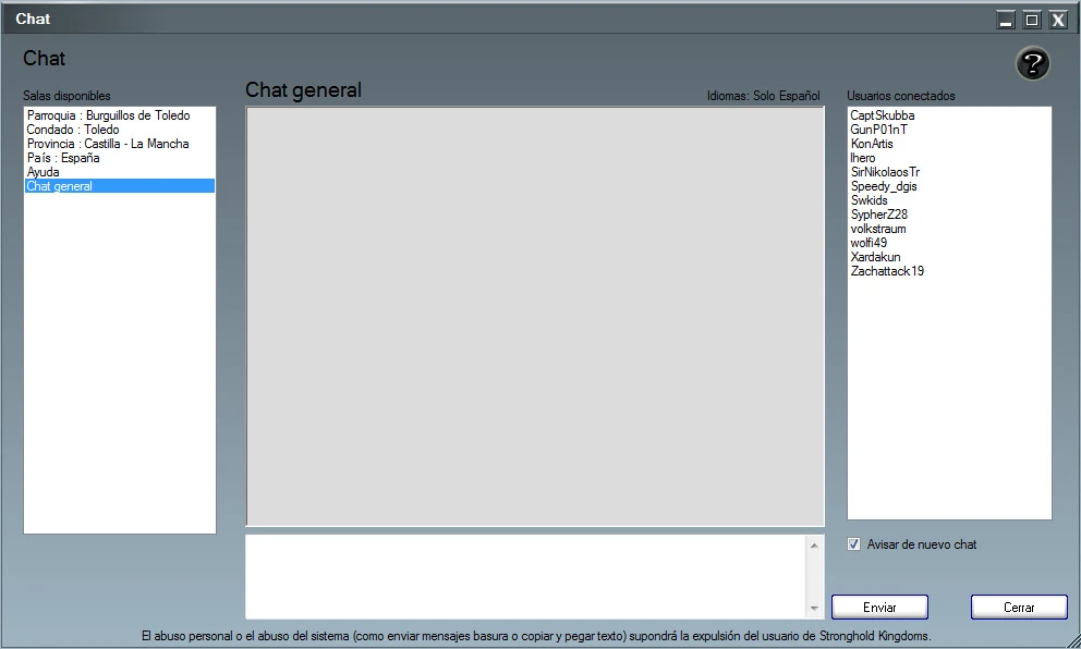 El sistema del chat del juego te permite acceder a las salas de chat de tu facción, Casa y parroquia. También hay una sala de chat general a la que pueden acceder todos los jugadores. Si están conectados, podrás contactar con el equipo de atención al cliente a través de la sala de chat general. Si son varios los problemas que quieres comentar, es mejor usar el correo electrónico para contactar con Atención al cliente (en caso de no necesitar una incidencia). En estos momentos no hay función de MP (mensajes privados) en el juego.