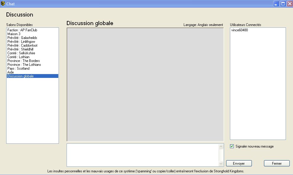 Le jeu offre des salons de discussions réservés aux factions, aux maisons et aux prévôtés, ainsi qu'un salon de discussion globale, accessible par tous les joueurs. L'équipe support, quand elle est connectée, se trouve dans le salon global. Si vous rencontrez plusieurs problèmes à la fois, il est préférable de contacter l'assistance par e-mail. Il n'y a pas de fonction MP. Pour accéder aux salons de discussion.