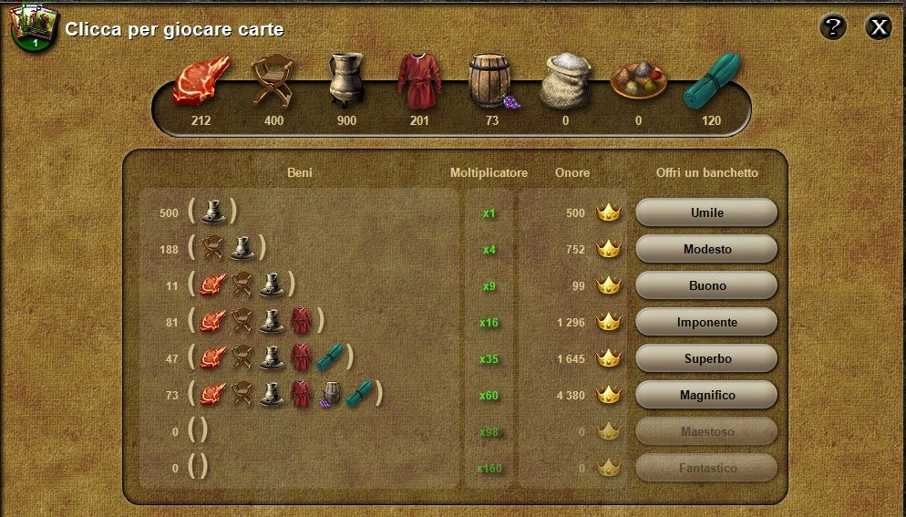 La parte superiore della schermata de banchetti mostra i beni disponibili per il banchetto. Questi dipendono dai livelli di ricerca Banchettare completati. Più alto è il livello di ricerca, più tipi di beni sono disponibili per i banchetti e più alto sarà il moltiplicatore d’onore. Dai un’occhiata alla tabella qui sotto.