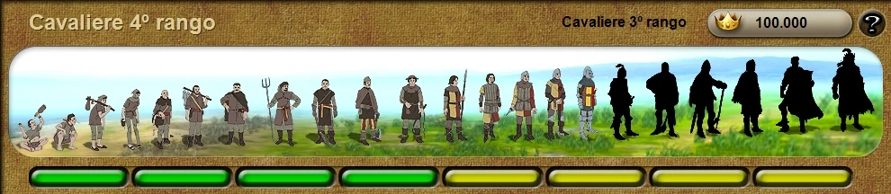 Quando si comincia il gioco, tutti i giocatori iniziano dallo stesso rango, ossia Scemo del villaggio. In tutto ci sono 23 ranghi diversi, ognuno dei quali presenta dei sotto-ranghi. A partire dal rango Cavaliere, il titolo assegnato dipenderà dal sesso dell’avatar del giocatore. Il costo in onore per salire di rango aumenta con ogni nuovo titolo ricevuto. Salendo di rango, oltre ad aumentare il numero di vassalli che può avere un feudatario, si renderà disponibile la ricerca per possedere più villaggi. Ogni promozione dà all’utente tre (3) Punti Ricerca da usare per nuove tecnologie e abilità, oltre a consentire l’accesso a rami di ricerca prima inaccessibili. Salendo di livello saranno disponibili anche nuovi motivi da usare per il blasone.