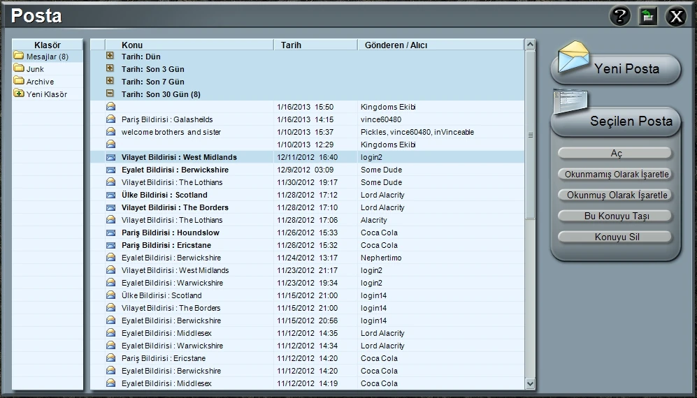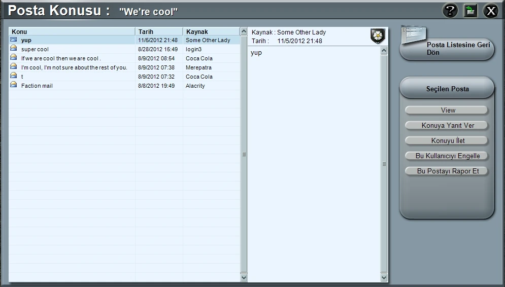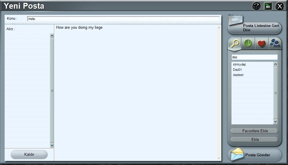 | Yeni Posta | Bir veya birkaç oyuncuya yeni bir posta yazmak için buna tıklayın. |