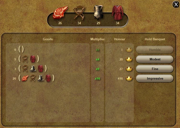 Ziyafet verme ekranının üstünde hangi ürünlerin verilen ziyafette kullanılabileceğini görüntülenir. Bunlar tamamlanan Ziyafet Verme araştırması seviyesine bağlıdır. Araştırma seviyesi ne kadar yüksekse, ziyafetlerde kullanılabilecek mal türü o kadar fazla olur ve böylece onur çarpanı da bir o kadar yükselir. Lütfen aşağıdaki tabloya bakın.
