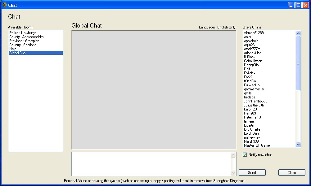 The in-game chat system allows access to your Faction, House and Parish chat rooms; as well as a Global Chat room, which may be accessed by everyone in the game. If online, the support team will be accessible via the Global Chat room. If there is more than one issue which needs to be discussed, it is better to use the mail system to contact support (should a Ticket not be required). There is no PM (private message) function currently in the game.